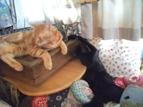 いつものお気に入りの涼しい場所を黒猫くんに譲っているごま。。。
