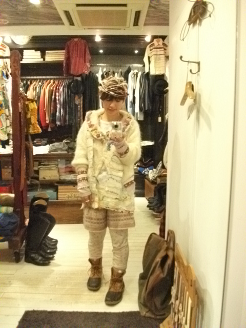 足元から、ビーンブーツ、古着のドロワーズ、サーマルトップス、カーディガンは古着。