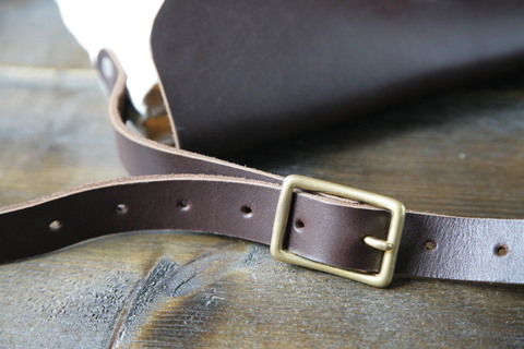 サイズアジャスター付きのショルダーストラップ。バックルは真鍮です。