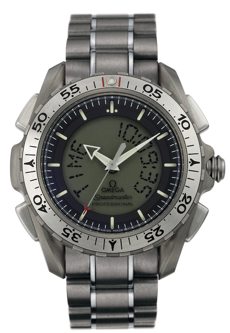 目を引くのは、デジタル表示と3針のアナログ表示を備えるハイブリッドなフェイス。42.25ミリ幅のケースはグレード2チタンでつくられ、ブレスレットもチタン製なのだとか。