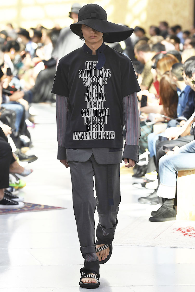 This "sacai x Spiber" T-shirt features the words "One small step for man, one giant leap for mankind. ( is a small step for one man, one giant leap for mankind. ) is printed with the words of Neil Armstrong, the first man to land on the moon.