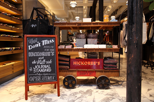 ニューヨークはブルックリンのトレンド発信エリア、ウイリアムズバーグにあるショップ<HICKOREE'S(ヒッコリーズ)>。本国アメリカは勿論のこと、日本のブランドを積極的に展開し、さらにはネクタイやチーフを展開するブランド<The Hill-Side(ヒルサイド)>も、このショップが手がけたオリジナルレーベルとして有名だ。ヒッコリーズのオリジナルウエアをジャーナルスタンダードと共同で製作していることなどもあり、以前からヒッコリーズのアイテムを取り扱っていたが、ショップ・イン・ショップという形態は今回が初めて。本国の実店舗同様に、温かみのあるディスプレイと充実した商品セレクトは、このスペースならでは。
