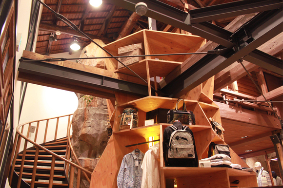 旗艦店として、随一の店舗面積を誇る「MSPC PRODUCT sort OSAKA FLAGSSHIP STORE」の特徴は、その広々とした空間を最大限に利用したダイナミックなディスプレイ。鉄筋と梁を組み合わせて製作された骨組みや、ヴィンテージのスピーカーを隙間なく埋め込んだ天井など、至るところにこだわりが光ります。