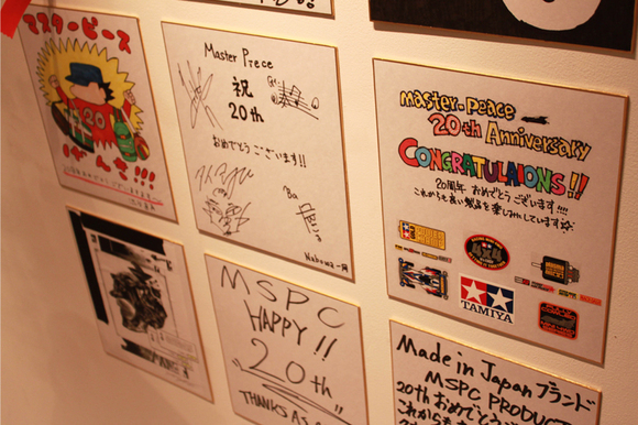 2F奥の展示スペースにて、3月1日から27日までの期間限定で開催されているエキシビションイベントがこちら。1998年に誕生して以来、定番として作り続けられている"OVER"シリーズのアニバーサリーシリーズ"20周年リミテッド"や歴代モデルが展示されるほか、特別に製作された20周年記念ムービーも放送。さらに、Mou Sou Poetic Colimnでお馴染みの渋谷直角さんや、以前インタビューさせていただいた〈ノワート(nowartt)〉のクリエイティブディレクター・足立豊樹さんをはじめ、ブランドと所縁のあるクリエイターの方々が描いた、お祝いの色紙がズラリと並びます。