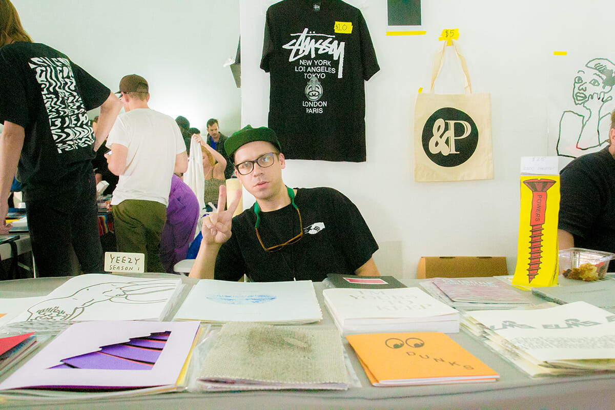 個人的に注目していた出店者の一部をここでご紹介します。数々のブランドに携わり、現在は〈パワーズ〉を手掛けるエリック・エルムズ、過去には〈ヴァイナル アーカイブ〉ともコラボレーションし、〈コム・デ・ギャルソン〉の18S/Sのアイテムにもアートワークを提供しているアーティストのステファン・マルクス、人気ブランド〈ブレインデッド〉のアートワークも手がけるアーティストのエド・デイビスによるヘビータイム ブックス、過去にフイナムでもインタビューが掲載されている、LAのデッドビート クラブ、サンフランシスコのハンバーガーアイズ、日本から圧倒的なクオリティの高さのzineを携え出店していたコミューンなどなど。名前を挙げ出せば、枚挙にいとまがありません。写真はありませんが、コペンハーゲンのV1 ギャラリーはこの“NYABF”に向けて、バリー・マッギー、アリ・マルコポロス、マット・ダムハブなどのビッグネームなアーティストたちと数多くのzine制作しており、終始ブースも賑わっていたのが印象的でした。
