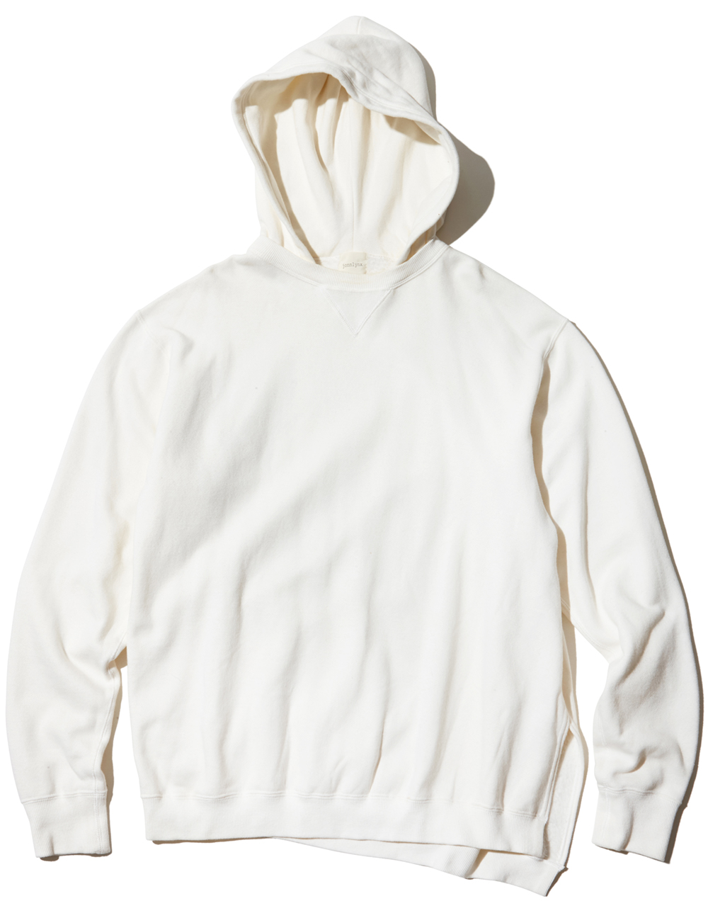 〈ジョンリンクス〉と出会ったのは、一昨年の夏。ローカルのサーファーや服好きが集まる福岡・平尾の高感度ショップ「トラリ」に訪れた際に、オーナーの方から紹介してもらいました。もともとレディースブランドということもあり、胸元がざっくりと開いたシャツや、スカートなどがディスプレイされている中にメンズアイテムも一部取り扱いが。それ以降、定期的にチェックしていましたが、このフーディには物欲がそそられました。サイドに大きなスリットが入っていて、前と後ろの身頃の長さが違うんです。程よいエッジの効いたディテールが、スタイリングのアクセントに一役買ってくれます。また、上質なコットンを使用しているので、極上の着心地を体感することができます。ちょっと大きめのサイズで着るのが良さそうです。