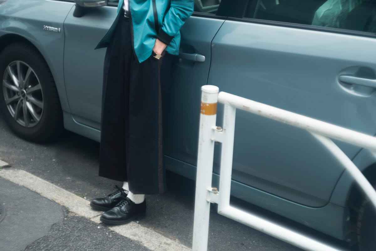 井田:そうですね。とはいえワイドパンツは難しいアイテムなので、コーディネートにメリハリを出すためにインナーをタックインして引き締まりのあるスタイルにしています。足元は革靴を合わせて品のある着こなしにしているところもポイントです。