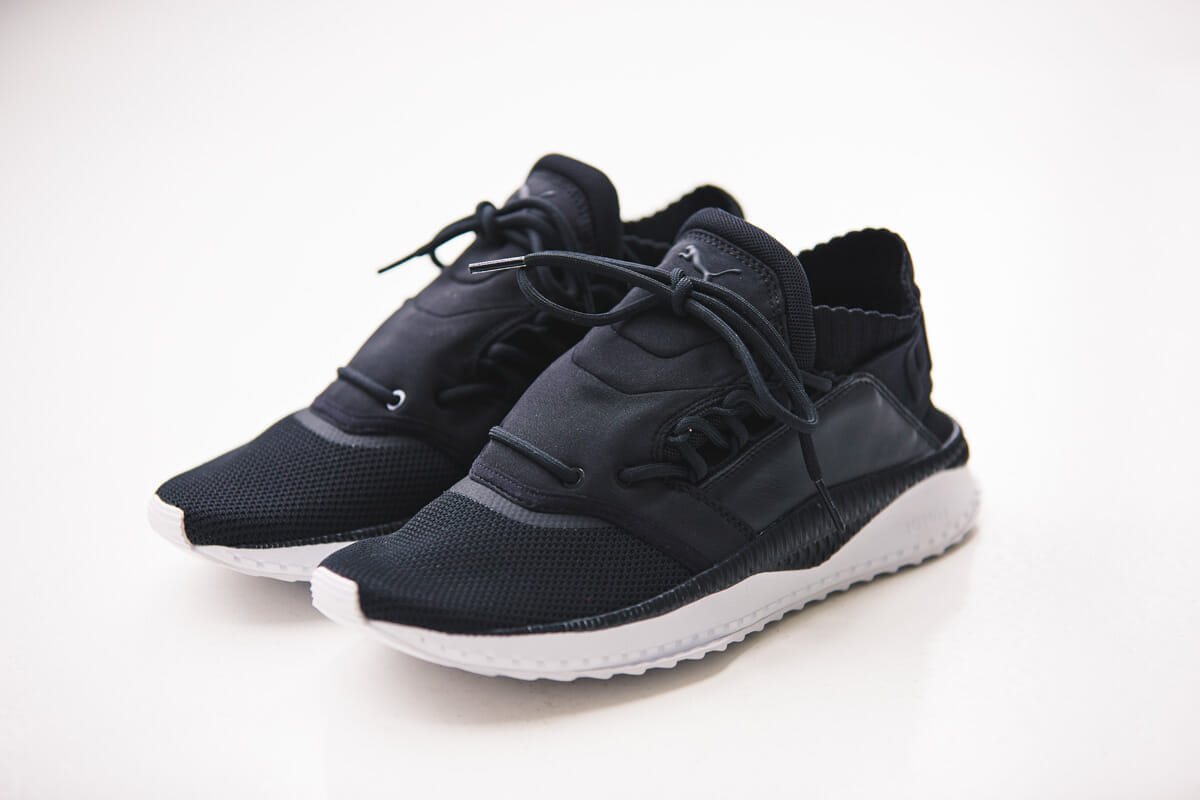シューレースをアッパー側面に配置したユニークなデザインが印象的なプーマの新作。反発性と衝撃吸収性を兼ね備えたIGNITEフォームの新しいソールを採用しているうえ、履き口にはネオプレーンとゴムバンドを配することで、快適な履き心地とスムーズな着脱を実現。ヒールを踏んでサンダル感覚で履くこともできる。TSUGI SHINSEI ¥12,500+TAX