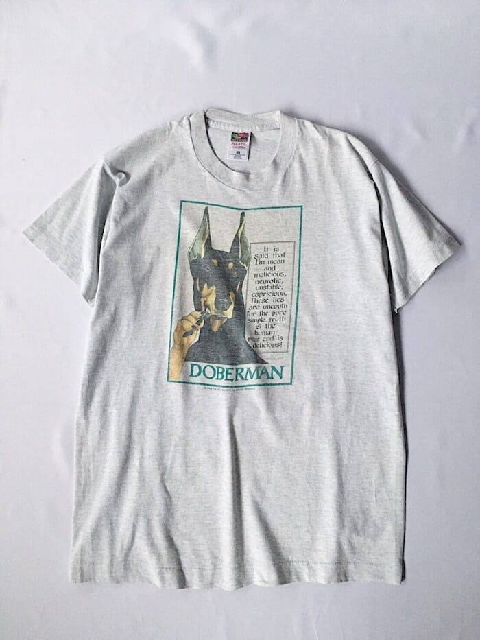 ドーベルマンが我々に物を申したいそうです。1993年製のプリントTシャツ。