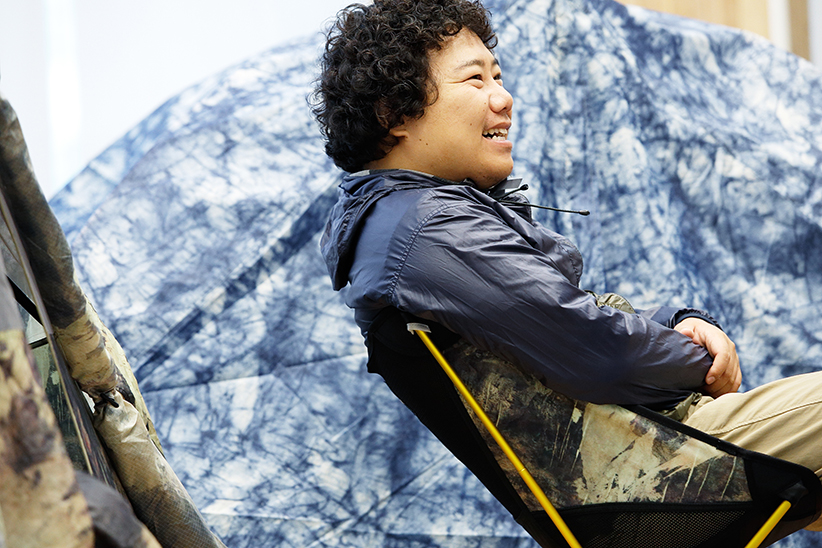 音楽フェスなんかにおすすめですね。近年はテントを張って泊まるスタイルが定着してきたので。そういった会場だと今は〈ノルディスク〉の白いテントがすごく流行っていて、あとは色が着いていても黒とかオレンジ、グリーン、ベージュやサンドといったシンプルな配色が多いから、〈バートン〉の総柄はすごく目立つと思います。自分のテントがすぐに見つかる(笑)。