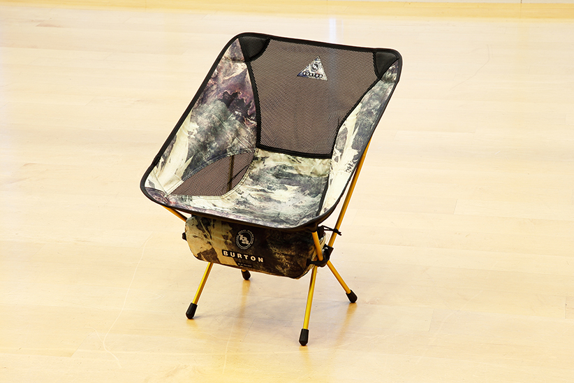 「最近は色々なブランドが〈ヘリノックス〉とコラボしているんですけど、こういった個性的な柄は珍しいです。あとは、組み立てるときに裏面と生地の上下を識別しやすいように“UNLOAD HERE(=リフトを降りる時に看板に書いてある「ここで降りなさい」の意)”っていう注意書きがあるのですが、これも〈バートン〉ならではです」。