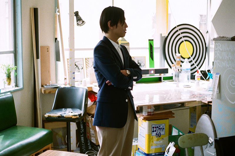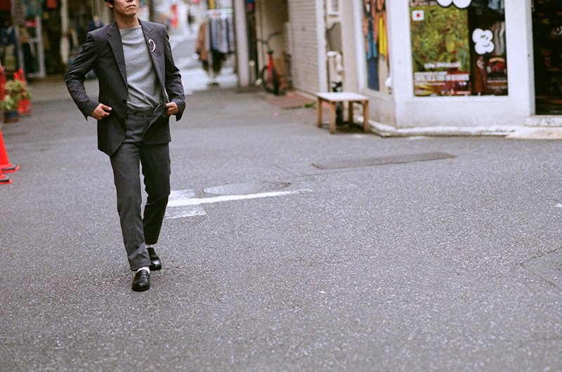 「テーラードジャケットにはノーカラーのシャツがおすすめ。スタイリングはナチュラルカラーのスニーカーで軽さを演出」
