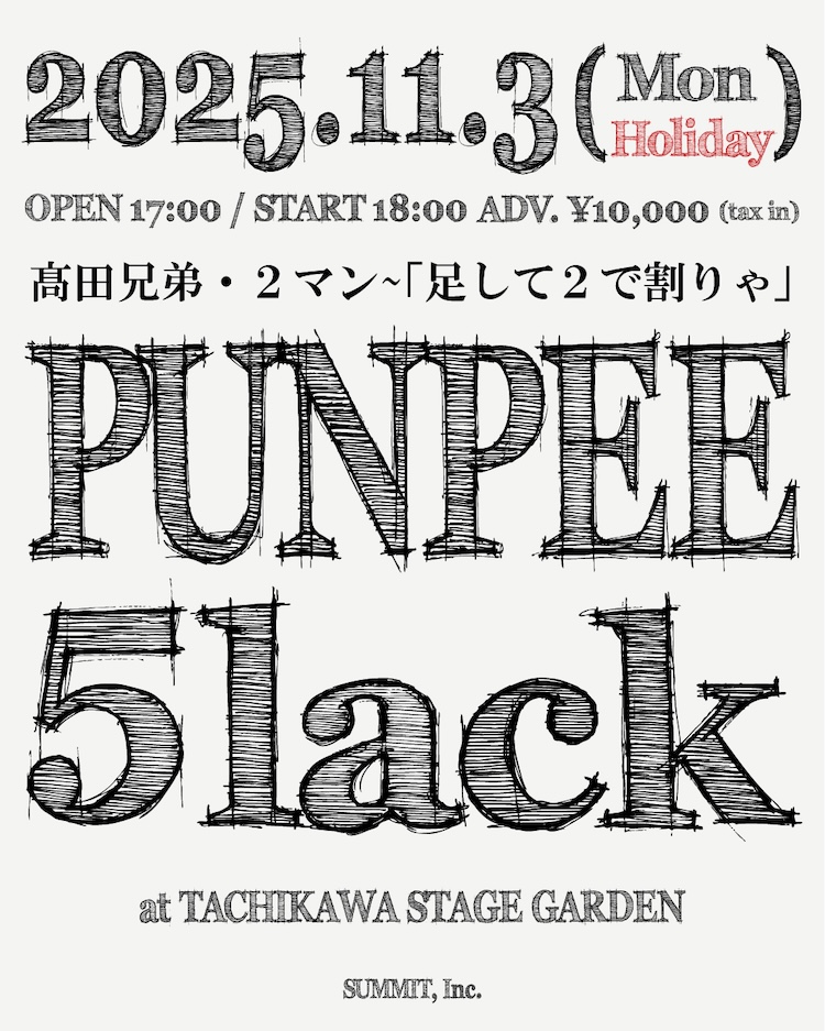 そんなPUNPEEが、9月19日(金)に地元の「板橋区立文化会館」にてワンマンライブを開催し、その翌日の9月20日(土)に『花里舞』を発表した実弟の5lackと、11月3日(月・祝)にツーマンライブを開催します。