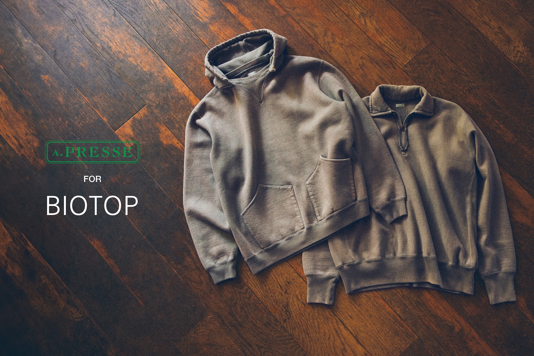 そこで推したいのがこちら。「ビオトープ(BIOTOP)」と〈アプレッセ(A.PRESSE)〉による別注スエットです。展開は2型、ハーフジップスエットと後付けフーディ。独特の風合いが漂うグレーカラーで仕上げられた、渾身の別注品をご覧ください。