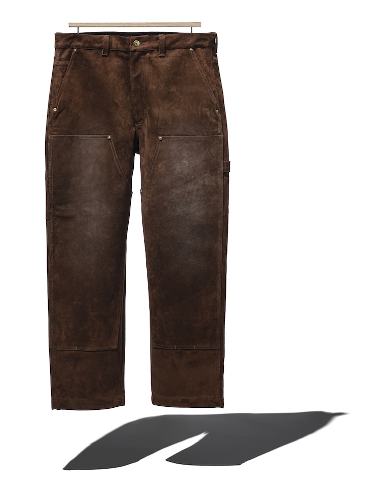 今回ベースとなったのは、〈ネクサスセブン〉定番のスエード素材のダブルニーパンツ。このコラボではブラウン、オリーブ、ブラックの3色で展開しています。ラムダンのこだわりでもある、手作業で施されたほどよいエイジング加工も大きなポイント。穿き込む毎に味のある一本へと育っていきます。