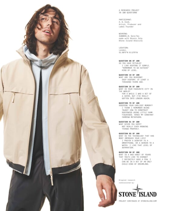 このキャンペーンに起用されたのは、これまでも度々〈ストーンアイランド〉のビジュアルに登場した、イギリス人のミュージシャンでプロデューサーのエージー・クックです。