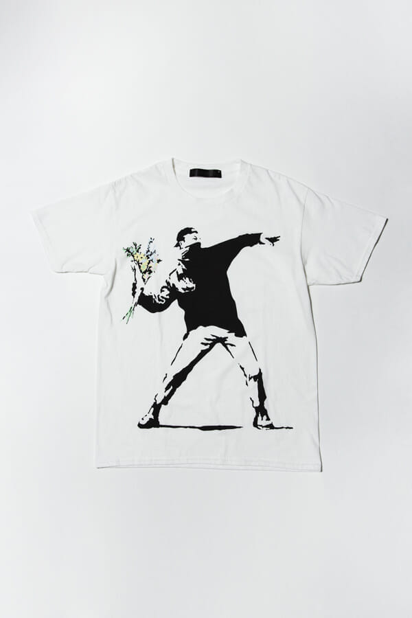 バンクシーの代表的な作品である「Flower Bomber」「Monkeysign」「Lizzie Stardust」をフロントに大胆にあしらい、「Lizzie Stardust」のTシャツはバックに“世界でもっとも有名なアートだが、誰も作者を見たことがない。見えないのだ”というバンクシーを表した文が綴られています。