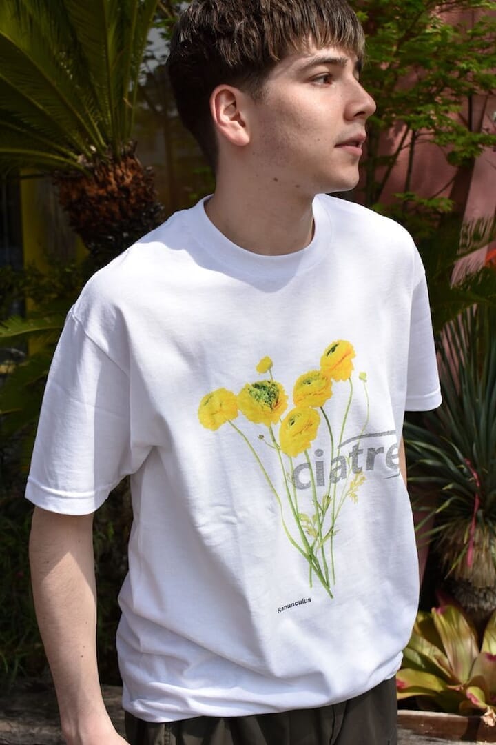 SNSで爆発的な人気を誇る大阪発のブランド〈シアター(ciatre)〉と東京のフラワーショップ「オールグッドフラワーズ(ALL GOOD FLOWERS)」のコラボTシャツです。