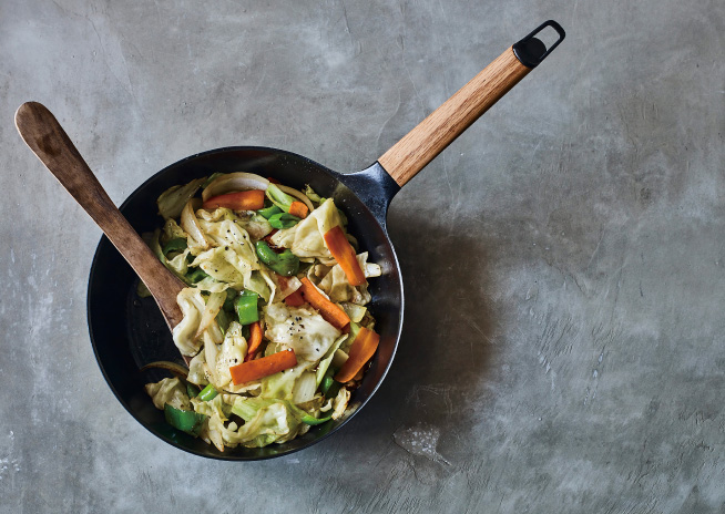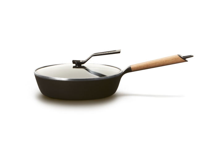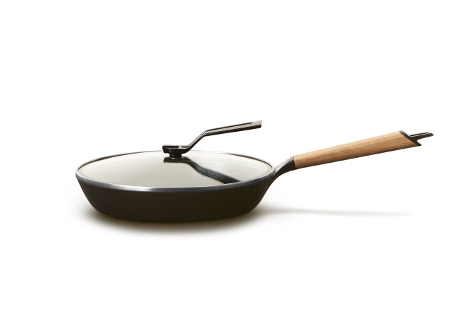 鉄のフライパンが抱える問題である焦付きやすさを解消し、薄さ1.5mm、重さわずか約1.1kgにすることで、「鉄のフライパン=プロのもの」という常識をくつがえす使いやすさを実現しています。持ちやすさを追求したという、削り出しウッドハンドルのフォルムも美しい。洗剤も使用OK、丸洗い可能です。