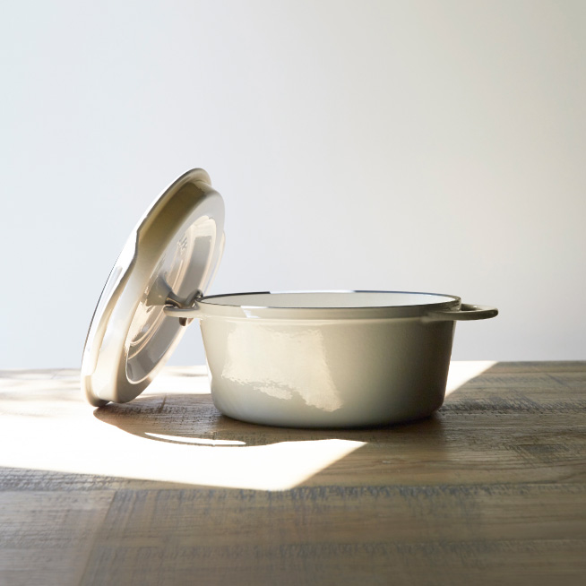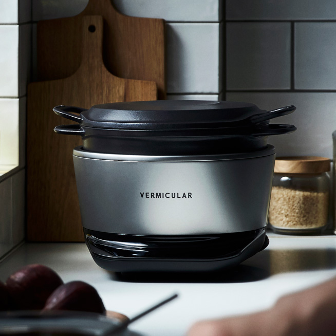 〈バーミキュラ〉は、メイド・イン・ジャパンにこだわる鋳物ホーローの調理器具をつくっています。有名なところでは、無水調理ができるオーブンポットラウンドや、デザインや機能により炊飯器のイメージを刷新したライスポットなどがあります。
