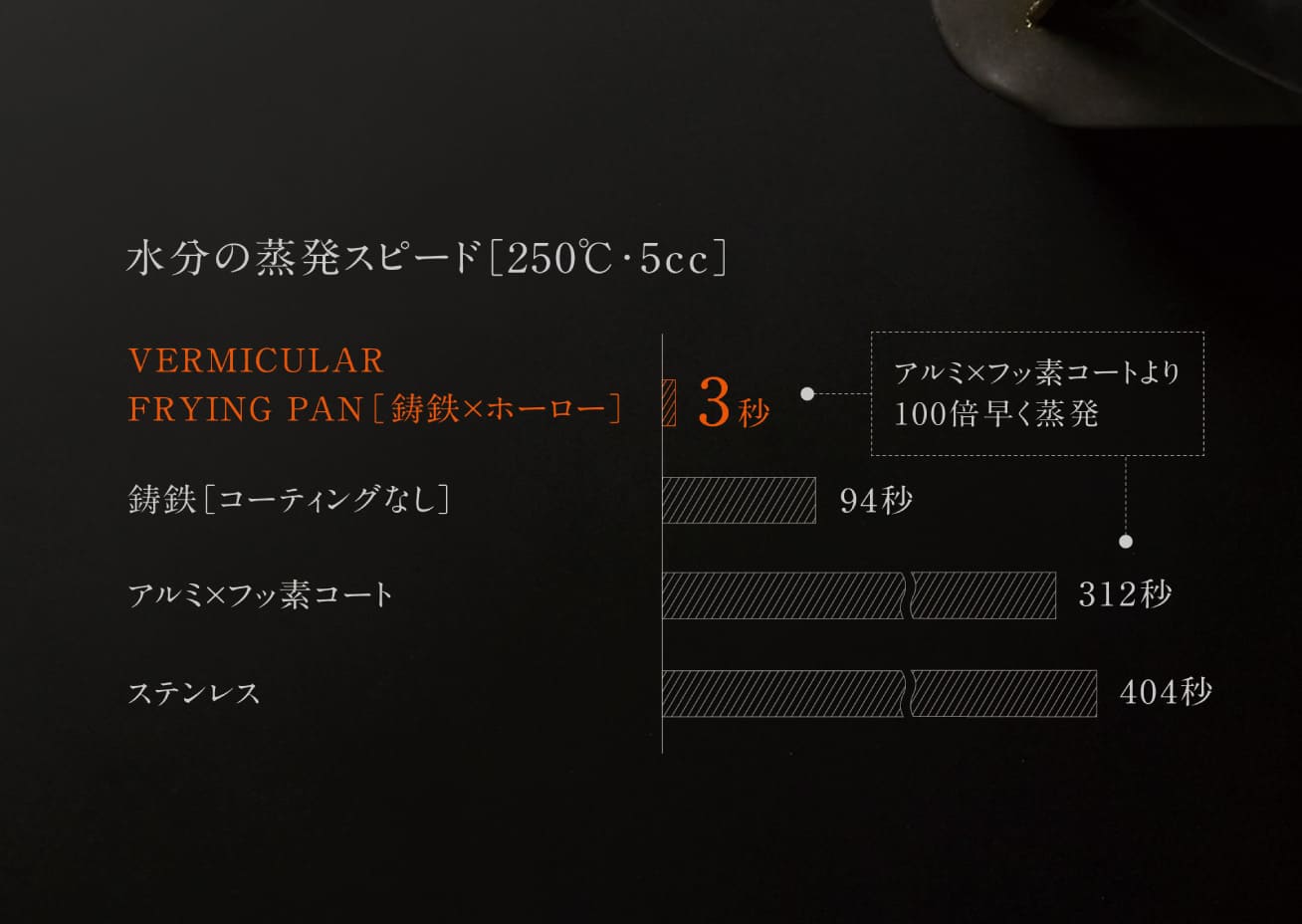 「瞬間蒸発フライパン」と名打つこの製品の特徴は、なんといってもその高い調理性能。上記のグラフの通り、その蒸発の速さは圧倒的。食材から出た余分な水分を、瞬間的に蒸発させて旨みを凝縮します。